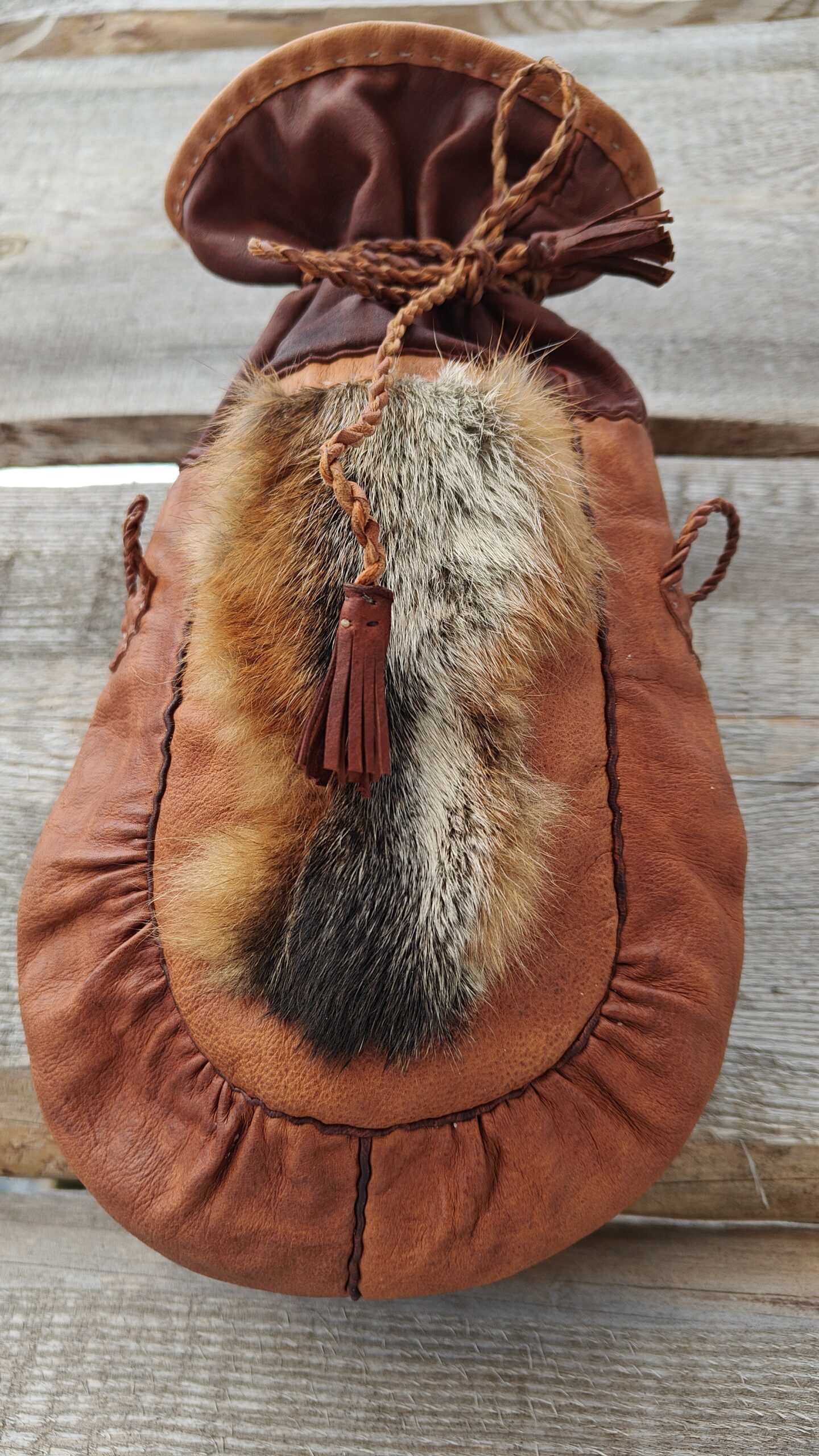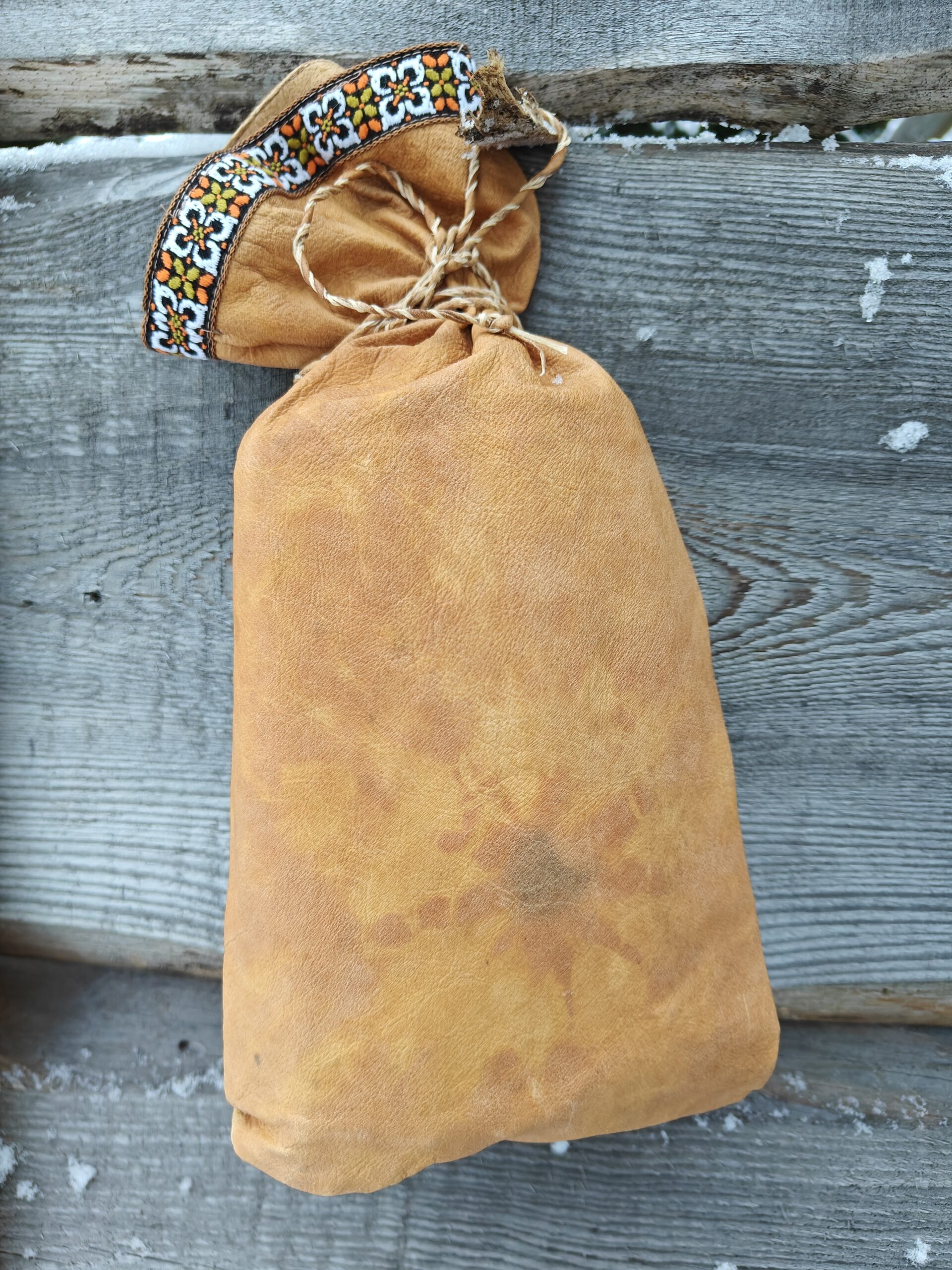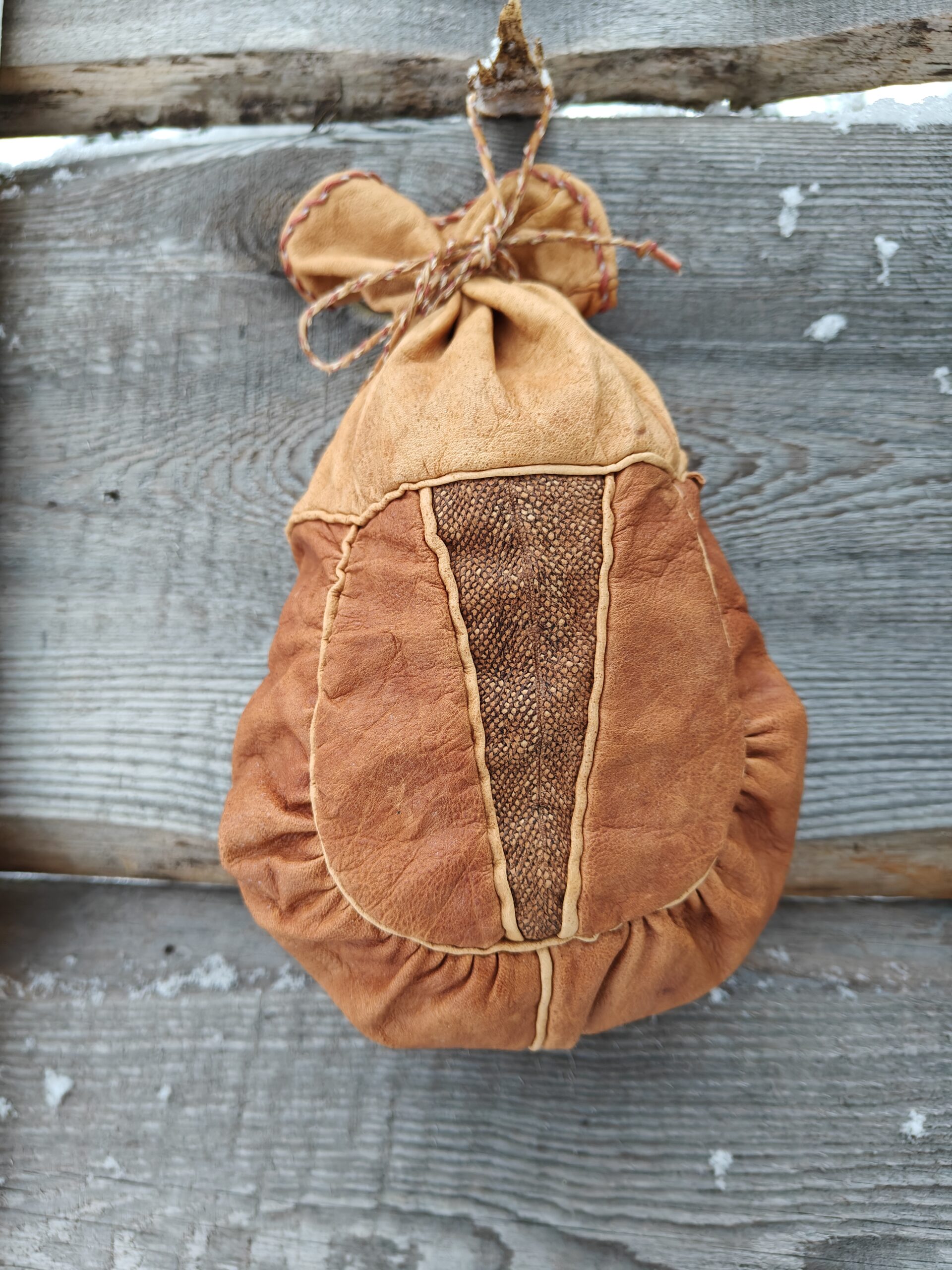 Perinteisellä menetelmällä kasviparkitusta poronnahasta eli sisnasta käsityönä valmistettuja Kahvipussukoita.