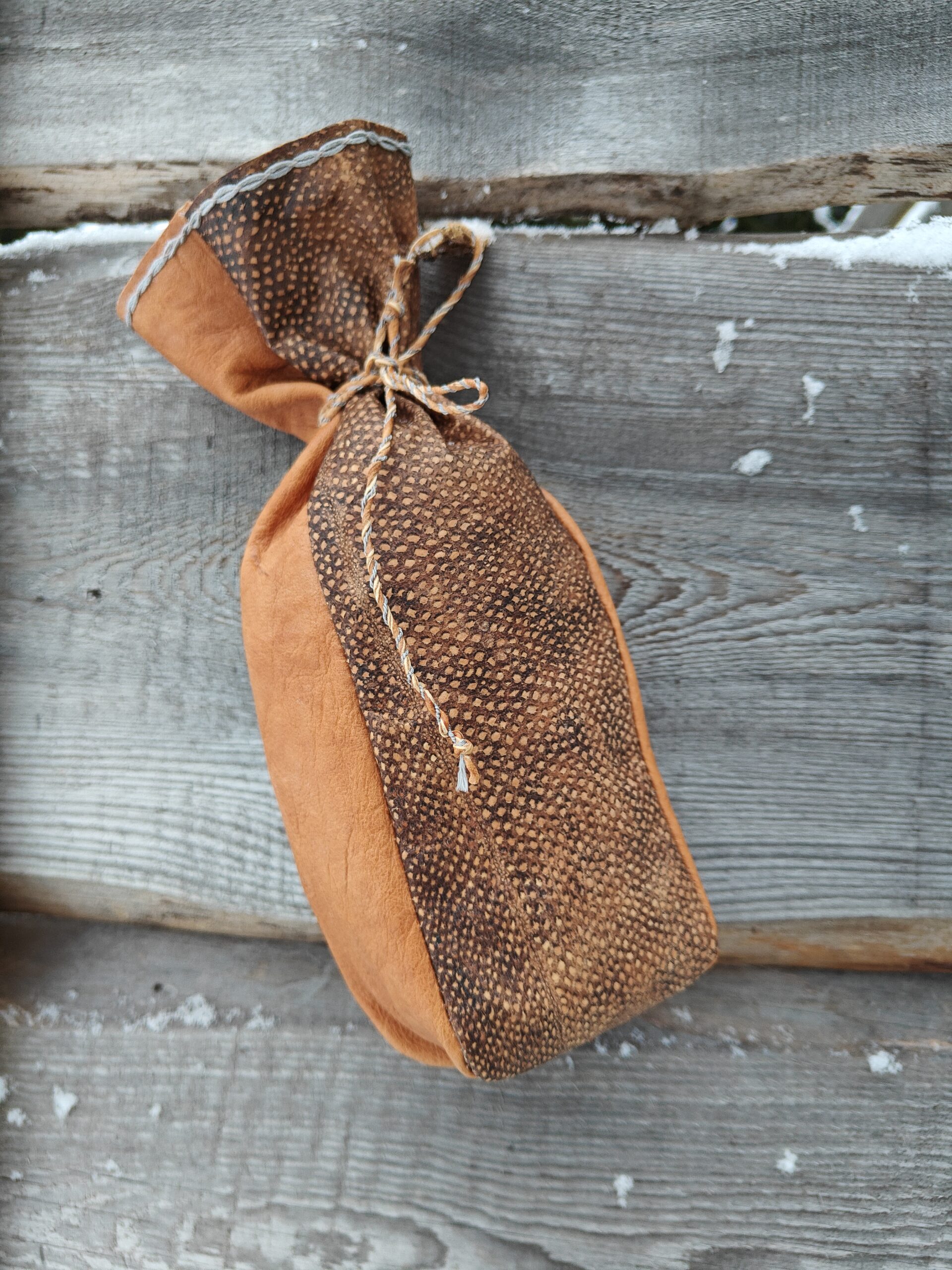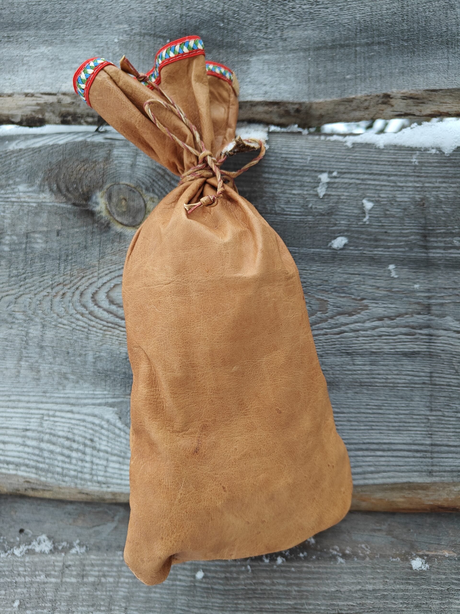 Perinteisellä menetelmällä kasviparkitusta poronnahasta eli sisnasta käsityönä valmistettuja Kahvipussukoita, johon mahtuu 500g kahvipaketti.